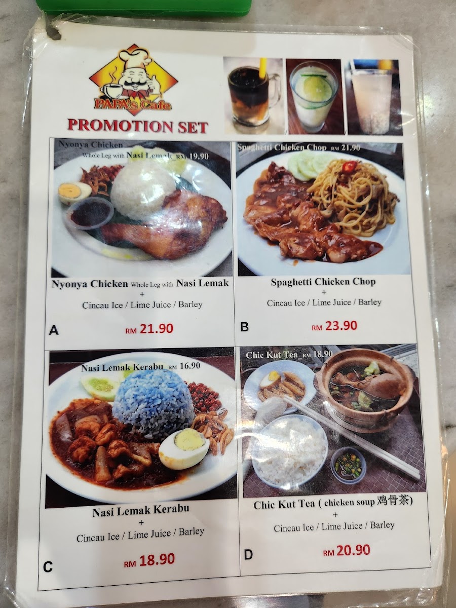 Welcome to Papa's Cafe, a charming eatery nestled in the vibrant 3Damansara Shopping Mall, Petaling Jaya. Here, nostalgia meets culinary delights, with a menu that celebrates classic dishes in a heartfelt atmosphere. The diverse offerings include delicious noodle dishes like the Fried Glass Noodle and Nyonya Curry Laksa, alongside aromatic fried rice selections such as the savory Chinese Fried Rice. The cafe also features a comforting range of rice dishes, including the richly flavored Curry Chicken Rice.